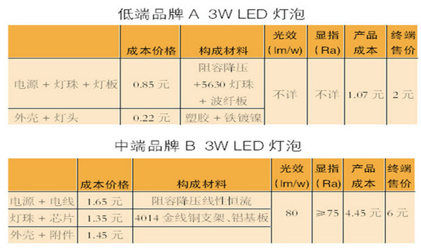 中端3WLED燈泡的材料是阻容降壓線性恒流的電源電線,4014金線銅支架、鋁基板,成本價比低端產品的高出了3倍,80lm/w的光效等參數皆有。明顯的中端產品各部件材料價格都比低端產品高出幾倍,從而終端售價也高了4元。